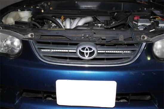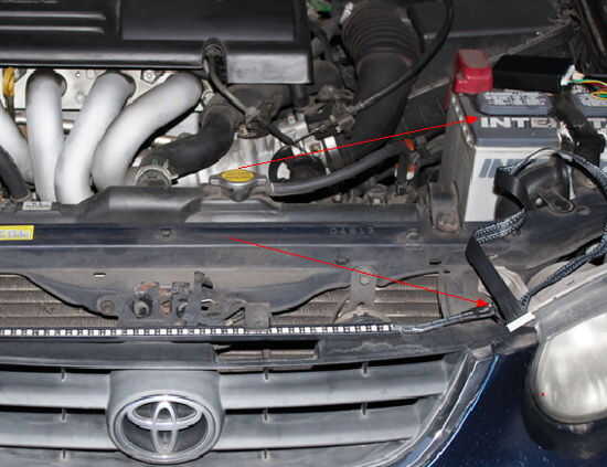 1) Coloque la barra de explorador de LED para que el lado del cableado está cerca de la batería del coche