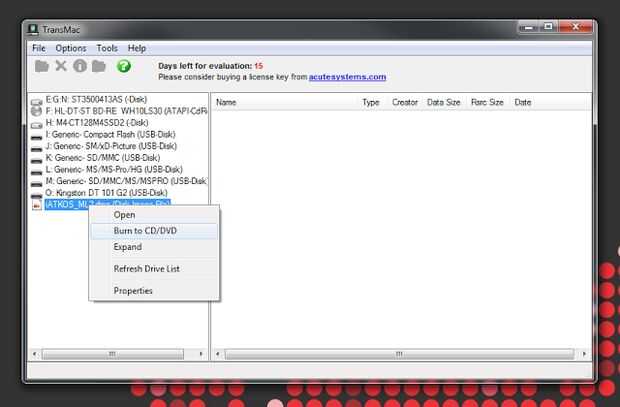 -Su iAtkos imagen aparecerá en la barra lateral izquierda de la ventana de TransMac. Haga clic derecho sobre él y haga clic en "grabar a CD/DVD". Luego quemar la imagen de disco (este paso se muestra en la segunda foto).