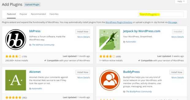 Ahora carga una nueva página que será por lista por defecto algunos de los más populares plugins de wordpress. En esta página, en la parte superior derecha encontrará un campo de búsqueda como "Buscar Plugins". En el campo puede introducir las etiquetas como el seo, social, negocios, etc. o de contacto. Incluso puedes escribir el nombre del plugin y buscarlo.