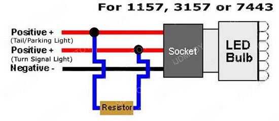 1157, 3157 y 7443 son doble aplicaciones de filamento que tienen tres cables (uno compartido negativo, uno positivo tenue y un positivo más brillante/luz intermitente). Es un poco más de ensayo y error con el cableado. Se recomienda que tocar la resistencia de carga entre el color más vivo de alambre (generalmente el más brillante/luz intermitente) y el menos el color del cable (generalmente negativo). En este tutorial vamos a tratar de aprovechar la resistencia de los cables rojo y negro.