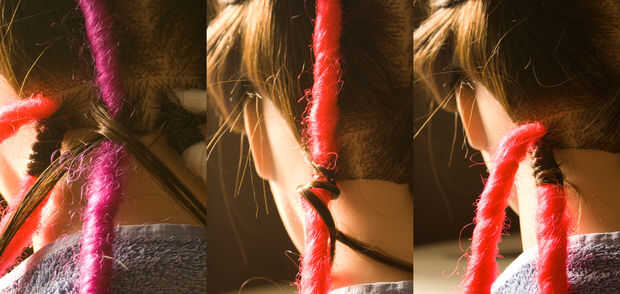 Tomar sus dos pedazos de pelo natural y cruzada sobre el temor (pic4), este le da tres secciones que pueden braid, mantener la tensión y la trenza (Foto 5), al llegar al final con una banda elástica (foto 6).