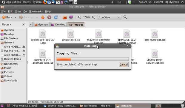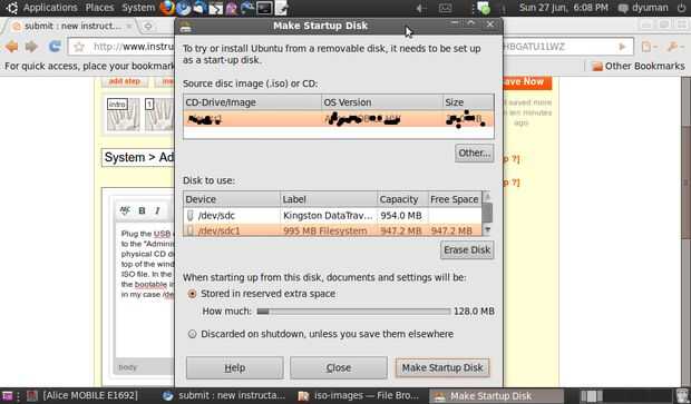 Enchufe el USB en el ordenador con Ubuntu ya instalado. Abra el menú del sistema, vaya al submenú "Administración" y seleccione "Startup Disk Creator". Si el CD de Ubuntu está en una unidad física de CD conectada al ordenador, puede seleccionar de la lista más hacia la parte superior de la ventana, de lo contrario haga clic en el botón "Otro" (justo debajo de la lista) y busque el archivo ISO. En el cuadro de lista, seleccione la partición en el USB que quieres poner la imagen de arranque (sí, por lo general hay una partición, pero aquí se debe ver el dispositivo, en mi caso/dev/sdc y la partición, en mi caso/dev/sdc1). Hacia la parte inferior de la ventana usted puede elegir si desea que cualquier documentos y los cambios en el USB a ser desechada en parada o guardarse en algún espacio extra reservado (sólo si se ha arrancado desde el USB). También puede elegir la cantidad de espacio a reservar para ello. En este punto, haga clic en "Hacer disco de inicio".