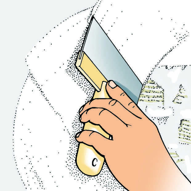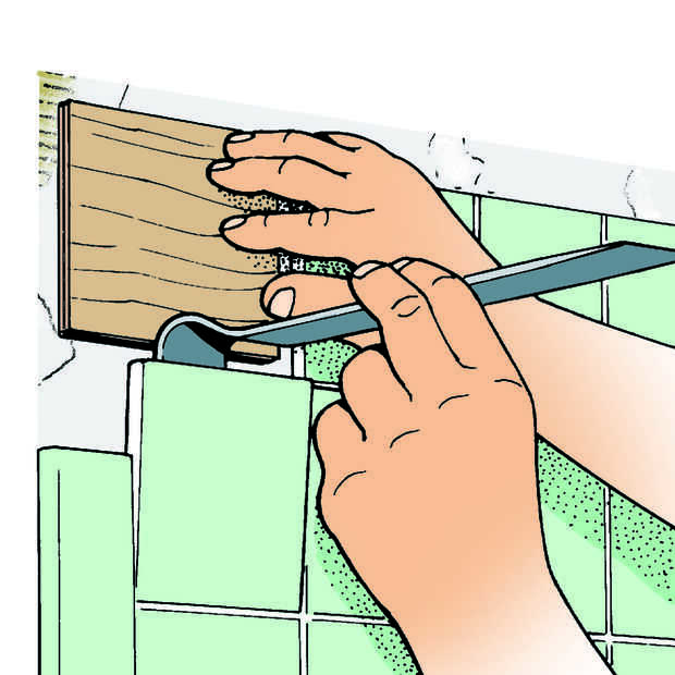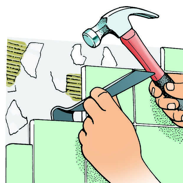 En primer lugar, cinta de cartón sobre la tina para protegerlo. Usar protección para los ojos, empezar en la parte superior y manejar una palanca pequeña de 1⁄8 de pulgada debajo del borde de cada azulejo (Fig. 1). Usando un pequeño pedazo de madera contrachapada de 1/4 pulg a palanca contra, levante con cuidado cada azulejo de la pared (Fig. 2). Cuando hayas quitado todos los azulejos, despegue los bordes irregulares de yeso roto y capa toda la zona con mezcla de tablarroca (Fig. 3). Cuando el compuesto se seca, la arena ligeramente, pintar con una cartilla de la mancha-matanza y deje que se seque completamente.