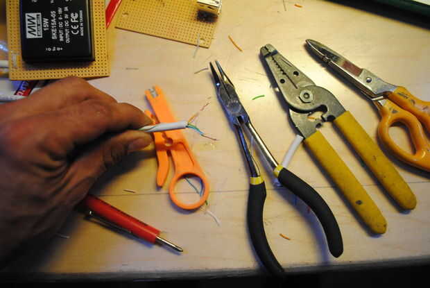 Prensar adecuada es esencial, y esto requiere desmontaje correcto de cable. Usar dos pares de cables CAT 5 para cada conductor (positivo y negativo).