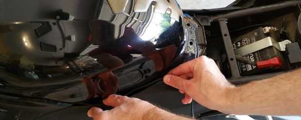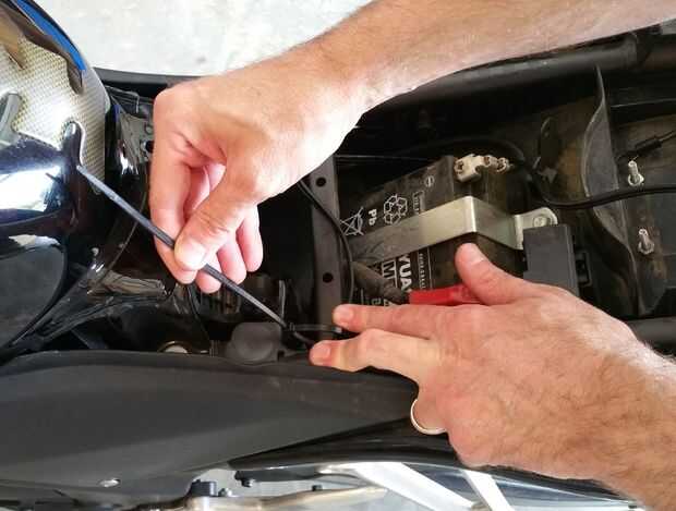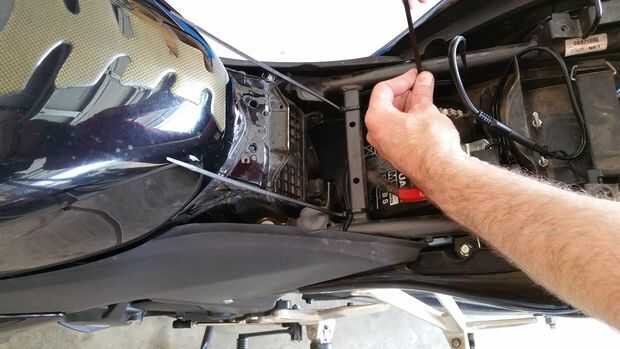 - Tire suavemente de nuevo en el carenado y deslice el cable detrás de él, evitando la brida de montaje para el tornillo que retiró.