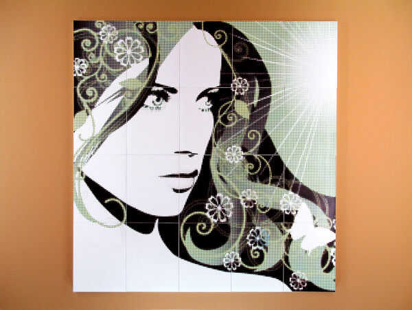 Retire con cuidado la primera fila del cartel anterior dejando los bloques adhesivo en la pared. (FOTO 9-2) Instale el panel izquierdo superior desde el nuevo cartel. Asegúrese de que esté alineada con el borde izquierdo y ajustado sobre el panel inferior. (FIG. 9-3) Instale el resto de los paneles en la primera fila. Asegúrese de que cada panel es ajustada con los paneles de la izquierda y la parte inferior. (FOTO 9-4)