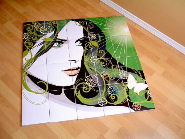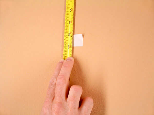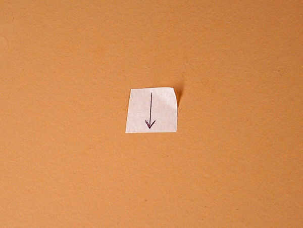 Montar su póster en el piso cerca de la pared que va a instalarlo en. (FOTO 3 - 1) Elegir qué tipo de espaciado que desea, 1/2" o 3/4". El cartel de Mida y añada el espaciado entre los paneles a su medida. Determinar donde la esquina superior izquierda irá en la pared. Márquelo con un trozo de cinta. Poner el borde inferior de la cinta donde irá la parte superior del panel. (FOTO 3-2) Dibujar una flecha donde irá el borde izquierdo del panel. (FOTO 3-3)