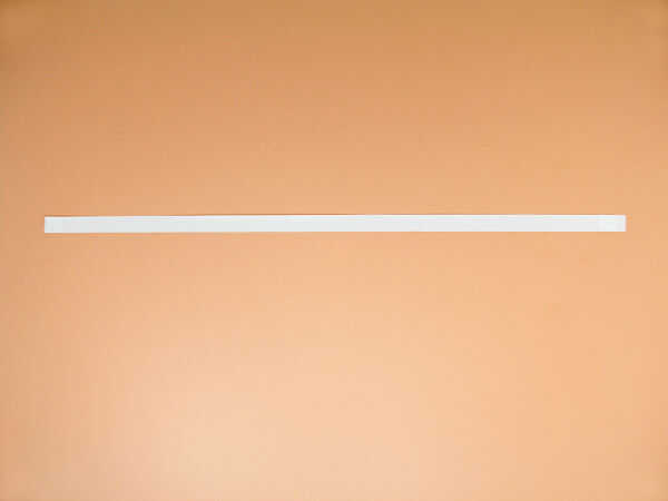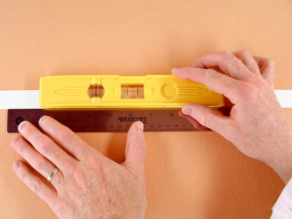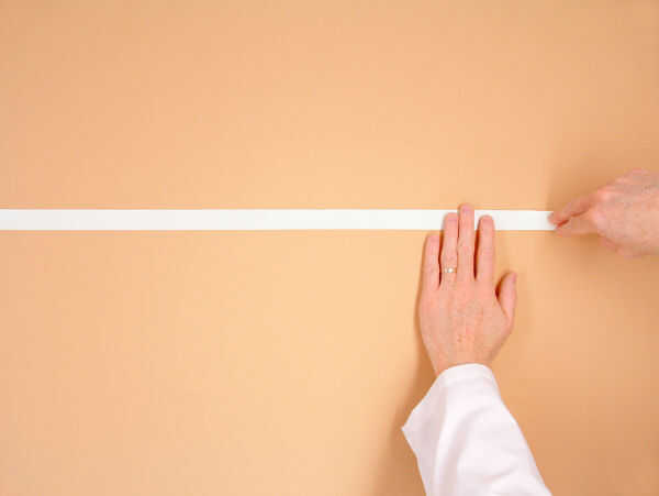 Estiramiento de una sola tira de cinta de la izquierda a su marcador derecho y alinear los bordes inferiores. Suavemente aplique la cinta a la pared. (FOTO 4-3)