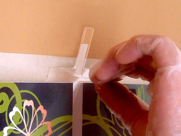 Coloque el panel en la pared y poner a la primera guía de rejilla entre los paneles en la parte superior. Ajustar suavemente el guía y el panel todos los bordes de contacto uniformemente y está alineado con el borde inferior de la cinta. (FIG 6-5)