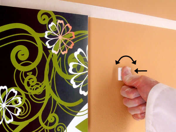 Coloque el panel junto al panel anterior con un boquete cerca el espaciado que desee (1/2" o 3/4"). Aproximado donde se encuentra el centro del panel en la pared manteniendo el bloque de adhesivo sobre el centro del panel. (FOTO 6 - 1)