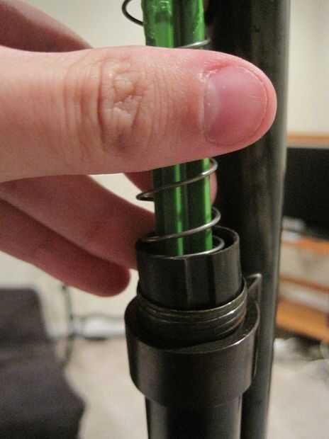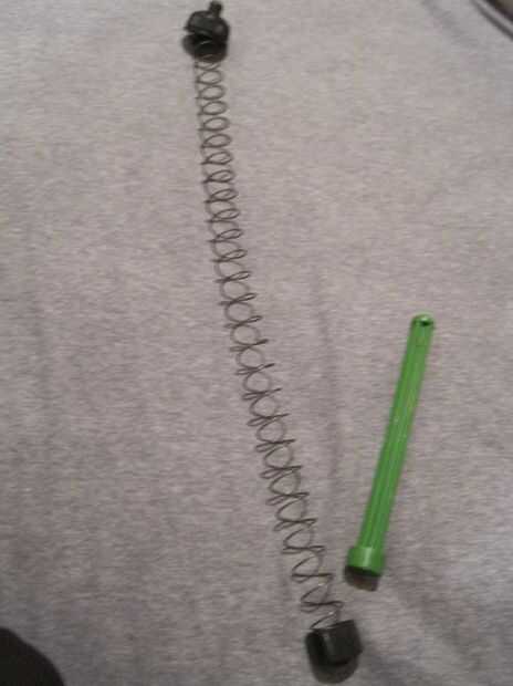 Una vez fuera de la tapa, saque el resorte y la parte inferior pedazo tapa de retención. Temporalmente eliminar la pieza de fondo y el enchufe en el resorte de la alimentación. Vuelva a colocar la pieza de abajo y ya estás listo para armar todo nuevo. Vuelva a colocar todo en el tubo.