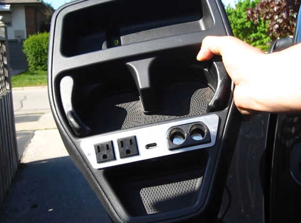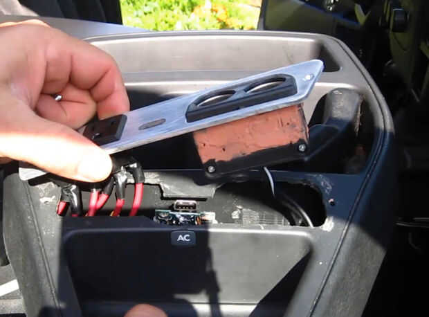 Cortar los agujeros en la consola para adaptarse a las espaldas de los tapones. Montaje del panel con 2 tornillos y tuercas.  Un poco de locktite o una arandela de bloqueo les evitará aflojar apagado.  Ejecutar los cables del inversor bajo la alfombra a la superficie de la consola. Conecte los conectores de los cables y asegurándose de que estén metidos en la consola, perno nuevo en su lugar.