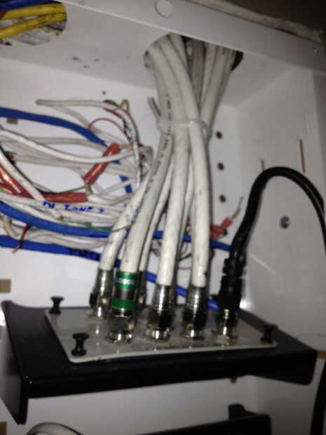 Esto instalé primero e inmediatamente por debajo de donde vienen los cables coaxiales en. Es más fácil que conecte a los conectores primero y apriete con los alicates, luego empuje el panel de la placa de montaje. Por último, solía un lazo de alambre de nylon sujetar los cables en su lugar y Sobrehilar la mirada.