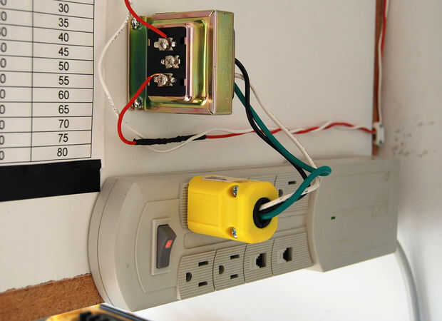 Directa alambré el transformador a una puesta a tierra, 3 clavijas y montada directamente sobre una tira de la energía cerca de mi mesa de trabajo. El resistor de 4.7 k Ohm fue soldado en su lugar y luego asegurado con un trozo de calor retráctil tubo que tenía a la mano; en esta foto, está directamente debajo del transformador .