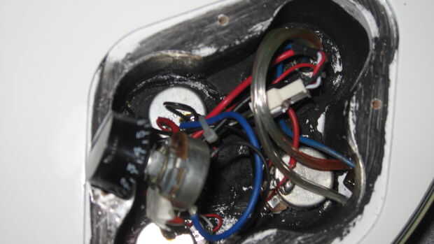 bien, abrir la parte posterior de la guitarra así que muestra todos los eléctricos,