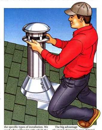 Chimeneas de metal especialmente diseñados están disponibles para manejar una amplia gama de aparatos de calefacción, de estufas de leña a los hornos convencionales. Ante la necesidad de una chimenea en una conversión de taller, optamos por una chimenea de acero inoxidable aislado Metalbestos fabricada por Selkirk Inc., 14801 Quorum Dr., Dallas, TX 75240; www.selkirkusa.com. Metalbestos el sistema que utiliza, el modelo SSII tipo HT, características de doble pared, aislamiento tubería de acero inoxidable disponible con diámetros de 6, 7 y 8 en interiores. Las longitudes de rosca simplemente juntos para montaje rápido.