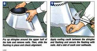 Luego, deslizar el tapajuntas debajo de las tejas levantadas (Fig. 8) y compruebe que el parpadeo se centra correctamente y que el agujero del techo proporcionará por lo menos 2 pulgadas de espacio libre alrededor de la tubería. Relift las tejas y los bordes del tapajuntas y aplicar sellador para techos. Entonces, uñas a lo largo de la parte superior y los lados (Fig. 9) y añadir un poco de masilla sobre las cabezas de clavos expuestos.