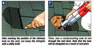 Alinee la chimenea intermitente sobre el agujero para que quede centrado y compruebe con un nivel. Luego, alcanzar en el vierteaguas y utilizar un cuchillo para marcar la forma y la ubicación del orificio de la chimenea. Eliminar el parpadeo y recorte las tejas (Fig. 6). Utilice una sierra reciprocante o sable de sierra para cortar a través de la azotea decking (Fig. 7). Para instalar el tapajuntas, primero cuidadosamente levante las tejas alrededor de los bordes de la mitad superior del orificio. Utilice una palanca plana para el trabajo y quitar clavos para techos que están en el camino.