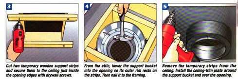 Clavar clavos 8d a través de la cubeta restante clavo agujeros (Fig. 4). Con el cubo de soporte en su lugar, retire la tira e instale la placa cuadrada de techo ajuste por atornillado a la estructura (Fig. 5). Dentro del espacio de ático utilizar una plomada o un nivel para transferir el centro de la canastilla de soporte de apertura en la parte inferior de la cubierta de la azotea. Entonces, un agujero a través del techo en el centro de la chimenea para que sea visible exterior. Hacia el techo y localizar el orificio central.
