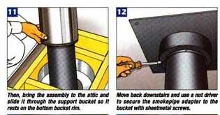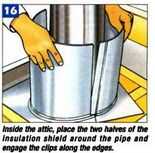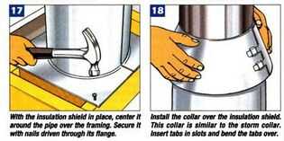 Para mantener el aislamiento del desván de la chimenea, instale el protector de dos piezas de aislamiento metal. Simplemente Únete las mitades alrededor de la chimenea (Fig. 16) y clavar el escudo en la estructura (Fig. 17). Luego, colocar el collar sobre la pantalla (Fig. 18). Añadir la longitud necesaria de la chimenea para llevar la altura a la distancia adecuada por encima del techo, asegurar las uniones con abrazaderas de anillo y conecte la tapa del tiempo. Cuenta que chimeneas que se extiende más de 4 pies por encima del techo requieren refuerzos.