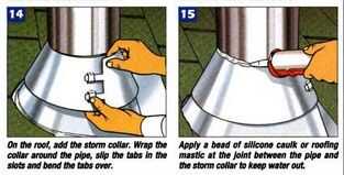 Hilo de rosca juntos suficiente tubo para alcanzar la longitud instalada por el tapajuntas (Fig. 13) y deslice el tubo hacia arriba mediante el parpadeo. Instale las abrazaderas de anillo suministrado para asegurar las uniones entre cada par de tubos. En el techo, instale el collarín de tormenta deslizando las pestañas de uno de los extremos en las ranuras en el otro (Fig. 14). Doble las lengüetas sobre y deslice el anillo hasta el tapajuntas. Aplique una tira de sellador de silicón para sellar la junta entre la tormenta y la chimenea (Fig. 15).