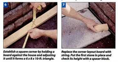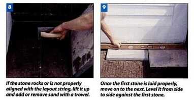 Con la cadena de arranque cuadrados en su lugar, deslice la piedra angular en la posición. Compruebe su altura deslizando su bloque de madera entre la cuerda y la piedra (foto 7). Luego revise si hay nivel de lado a lado. Para realizar correctamente el ajuste de piedra, levante para arriba y ya sea añadir o quitar la arena de la base usando una paleta (Foto 8). Pone la próxima piedra en su patrón. Mantener un conjunto de sobre 1/2 pulgada entre las piedras y verifique que los bordes correspondientes de las piedras estén al ras y que el segundo nivel con el primero de lado a lado (Foto 9). A medida que agrega más piedras siempre realice los bordes quedar al ras y verifique la pendiente general con frecuencia, especialmente al trabajar lejos de la casa.