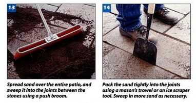 Tendrás que hacer algunas concesiones en este paso porque no todas las uniones se alinearán perfectamente. A favor de los que serán más visibles y dejar que los demás caen donde caen. Puede emboquillar juntas con cualquier arena — que usamos, o el polvo que está disponible en su distribuidor de piedra de piedra. Difundir el material usted elige el patio y use una escoba para rellenar las juntas (Foto 13). Paquete la lechada en su lugar con llana de un albañil o un hielo