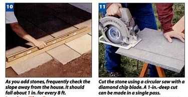 Un tablón largo con un nivel de 4 pies en la parte superior debe tener en el estadio de béisbol (foto 10). Corte piedra es fácil, aunque muy ruidoso y sucio, usando una sierra circular con una paleta de albañil que tiene chips de diamante consolidados hasta el borde. Estas hojas cuestan $15 cada uno y pasa limpio corte a través de piedra de 1 pulgada en una sola (foto 11). Trabajan mucho mejor y duran más que las hojas abrasivas de óxido de aluminio comúnmente disponibles. Una vez que se ponen todas las piedras, alinee los empates de lechada usando una palanca de la barra o barra plana (foto 12).