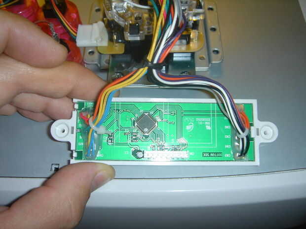 Si usted Levante los interruptores de turbo, la pieza de plástico blanco vendrá fácilmente lejos de la base. Dale la vuelta y verás todos los cables de conexión para PCB. Recortar cada uno de estos cables como cerca de la placa como sea posible. Vamos a usar estos cables, por lo que las queremos tanto como sea posible.
