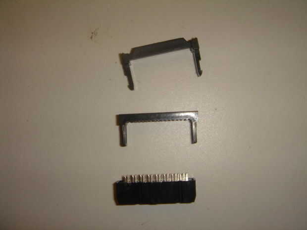 Agarra un conector IDC y desarme en todas las tres piezas. La parte que se conecta a la cabecera IDC tiene un número de dientes acanalados. Cada uno de esos dientes tendrá una y sólo una alambre en la ranura de ese diente. Cuando nos reunimos la próxima pieza en la parte superior, empujará a los cables hacia abajo profundo en el surco, empujando o cortar el aislamiento para que el metal del diente toca el alambre. Por eso se les llama IDC: conector de desplazamiento de aislamiento.