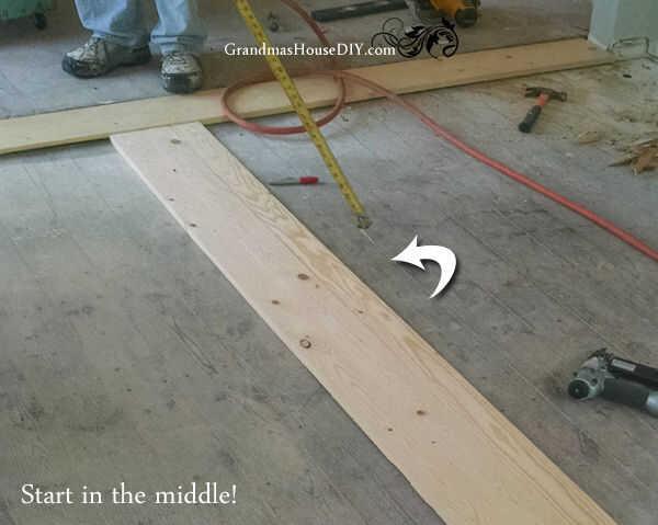 Hemos utilizado a una clavadora y brad largo pulgadas dos clavos para este trabajo. Joe clavó las tablas mientras que cortar con la Sierra de inglete exterior. Lo hizo dos clavitos cada pocos pies en una línea de cada tablero se ve muy consistente pero tienes que buscar cerca para verlos como clavitos son muy pequeñas. Compramos 1x4s largo 12 pies por lo que atravesaron la distancia de la habitación – 8 pies largo 1x4s hubiera sido más barato y habría hecho poco que no tiene desperdicio pero habría creado un montón de costuras y nuestros pisos de madera originales sin costuras. Este es uno de esos trabajos que una persona puede hacer pero es mucho más rápido y más fácil con dos personas que realmente deben tener dos personas. Me corte los tableros y Joe clavado abajo puso todo el piso en menos de 3 horas. Otras herramientas que hemos utilizado eran una sierra de calar y una habilidad Sierra para los cortes aburridos. Comenzamos en el centro de la habitación y trabajado nuestra salida por lo que cualquier herramienta era que una necesidad absoluta porque en tres ocasiones tuvimos que rasgar el 1 × 4 hacia abajo a lo largo algo que no hubiéramos podido hacer que largo de una distancia con nuestros ingletes Sierra y todavía no poseemos una tabla VI.