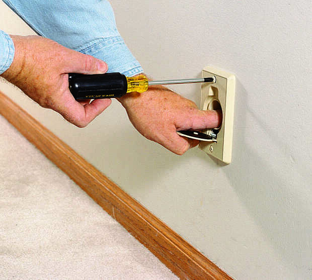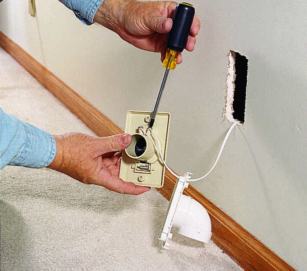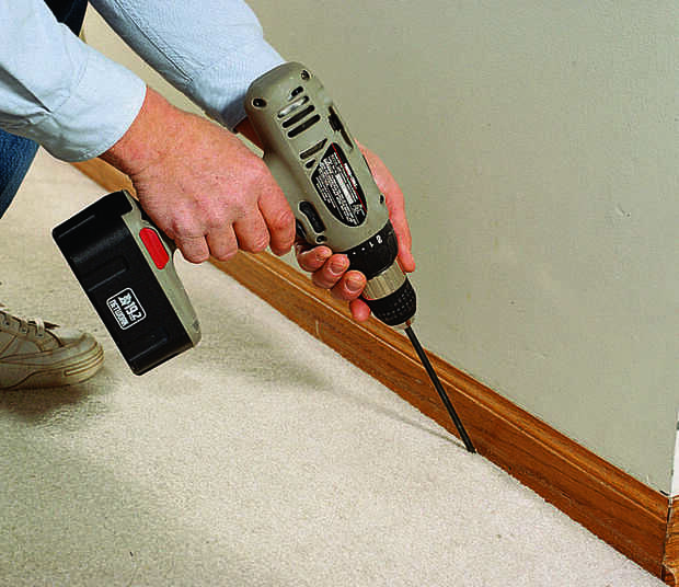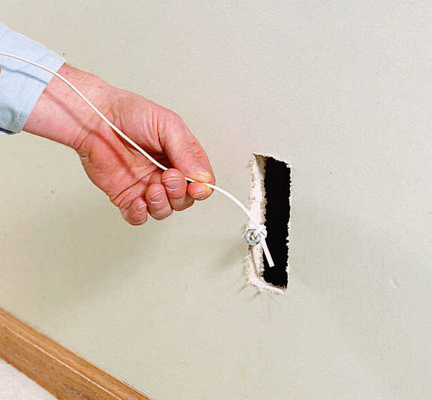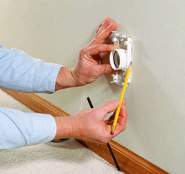 Cuando has encontrado un espacio vacío stud, marque su centro y diámetro en el piso junto a la pared con una broca larga 1/4-pulg (Foto 1). Deje la broca en el piso como un marcador. Romper el ala de fijación de un soporte plástico y sujete la abrazadera contra la pared, unos 12 pulgadas por encima de la broca. Trace una línea alrededor del soporte con un lápiz (Foto 2) y luego corte la abertura con una sierra de panel de yeso.