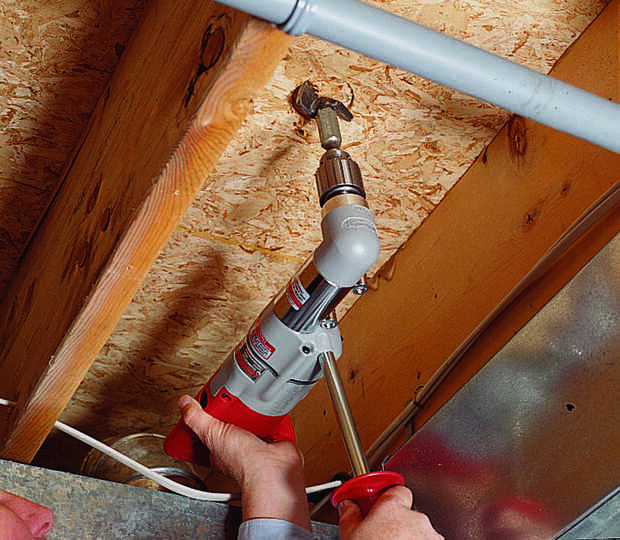 En el sótano, utilice la broca de largo en el piso para encontrar el centro de la pared anterior. Taladran la pared con un poco de auto alimentación 21⁄4 pulg (Foto 3). Alimentación, cable de baja tensión a través de la abertura de la pared y en el sótano (foto 4).