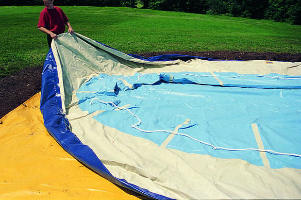 Necesitarás algo de ayuda, pero es fácil para un par de personas para manejar este cuadro con una carretilla de mano. El cuadro del rodillo a la mitad de la lona, quitar el cartón y las piezas pequeñas que se incluyen y luego despliegue la piscina revestimiento (foto). Centro de la lona y suavizar cualquier arruga en la parte inferior.