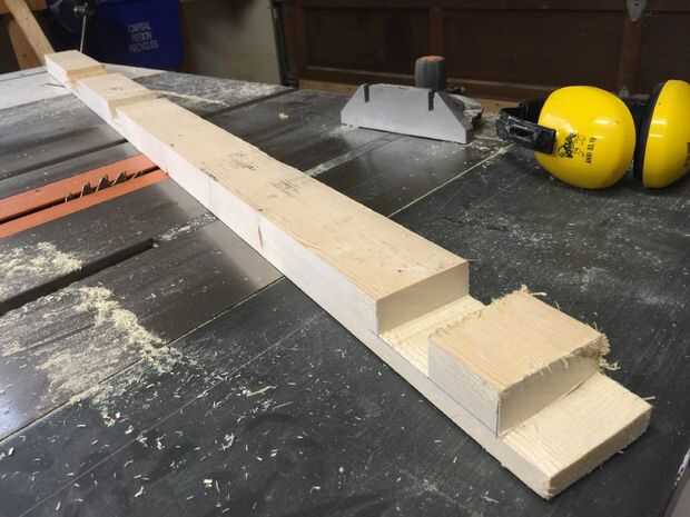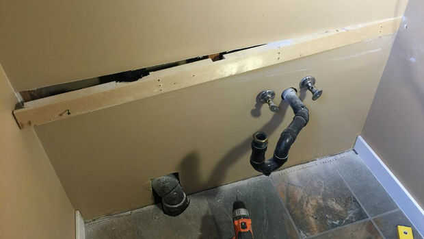 Vas a llenar el agujero que acaba de crear con la pieza de madera cortada a la longitud, pero en primer lugar usted necesita cortar muescas para acomodar los postes y los cables/tuberías que podría estar detrás de la vanidad. Usted quiere cortar la muescas profundas lo suficientemente para que el resto de madera es exactamente el mismo espesor de la mampostería seca. Lo hice con varias pasadas con una sierra de mesa pero una sierra circular o sierra de mano y cincel todo funcionaría muy bien también. Hice cortes para 4 pernos y un ducto de 4". Ninguno de los postes estaban en el lugar adecuado para la vanidad, pero molesto la ventilación fue exactamente el * mal * lugar. Esto significaba que tenía que utilizar tornillos más cortos para que soporte (no más que el espesor de la mampostería seca), pero mejor que no soporte, que es lo que tendría que haber hecho con el método recomendado (porque el yeso todavía estaría allí).