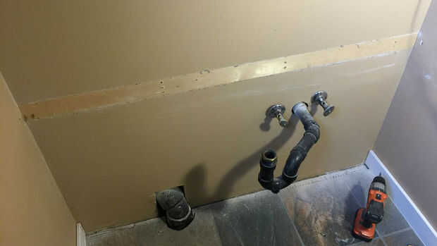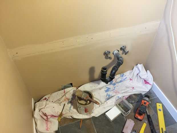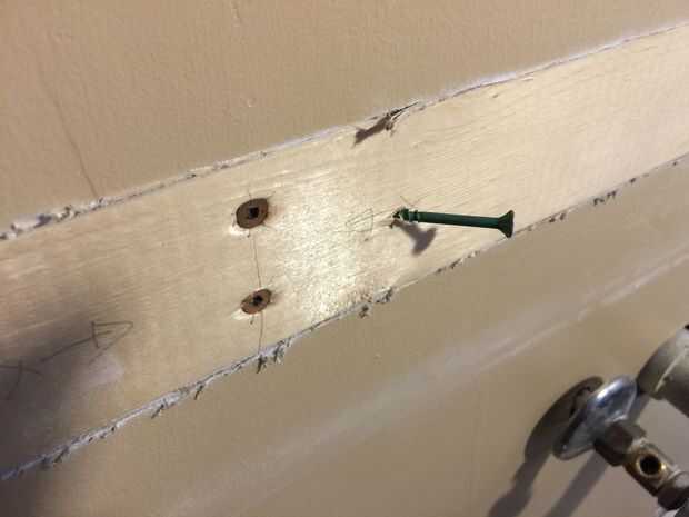 Introducir la madera en el orificio y atorníllelo en su lugar. No dependen sólo de tornillos por la parte estrecha de la madera a los montantes - también añadir ángulo ambos lados. Pintar la madera y el yeso. Sí, esto aún se va a ver un poco áspero, pero es la parte de atrás de su vanidad! Chill-out, no se verá. Está oscuro ahí y lleno de cosas. O pronto estará.