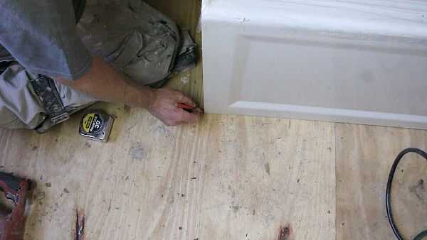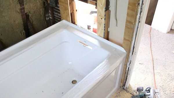 Después de hacer la Plaza de la bañera con las paredes adyacentes hicimos una marca en la pared de la tubería y la madera detrás de la bañera.