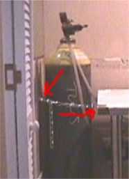 La pared detrás del tanque es un espejo, por lo que no se confunda ;) Antes de poner el tanque en su lugar, asegúrese de poner dos armellas en la pared a ambos lados de donde se sentará el tanque. A continuación, utilice una pequeña longitud de la cadena y algunos ganchos de sujeción o clips. Asegurar el tanque a la pared firmemente bastante que, no importa cómo usted Ladeándolo, su centro de gravedad hará que se pare detrás. La idea es que si algo toca o golpea el tanque, no caiga y busto de su grifo, causando el tanque para convertirse en un cohete (que es algo muy malo y podría causar lesiones o la muerte.) Si usted necesita ayuda con lo que se considera un sistema de sujeción apropiado, pedir a las personas de la soldadura. Como se puede ver en la imagen de abajo, ese tanque no va dondequiera.