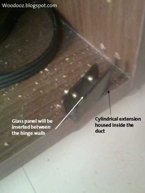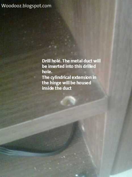 Ahora coloque la proyección cilíndrica de la bisagra dentro del conducto de tal manera que los bordes de la bisagra estén en contacto con las paredes del gabinete (superior e inferior)