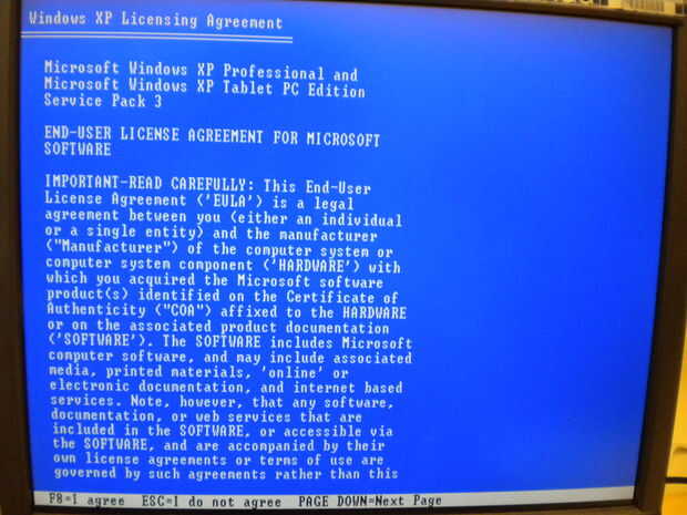 La siguiente página que verá es el contrato de licencia de Windows XP. En esta página, usted puede tomar el tiempo para leer a través del acuerdo, pero justo es decir que usted no se rompe ninguna ley con este producto. Yo personalmente simplemente pulse F8 (para ponerse de acuerdo) y pasar al siguiente paso en la instalación.