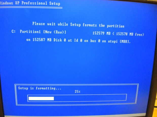 Con el tiempo, la barra de progreso se mueve por la pantalla, como se muestra en la imagen segunda donde se encuentra la barra de progreso en veinte y cinco por ciento. Después de que la instalación haya terminado de colocar el sistema de archivos en tu disco duro, verá el programa reinicie el equipo. No se alarme en este. arrancará atrás y verá una pantalla similar a la tercer foto en esta página.