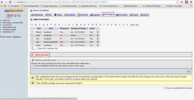Así que vamos a crear un nuevo usuario. Ir a la Página myPHPAdmin = > privilegios = > Agregar un nuevo usuario.