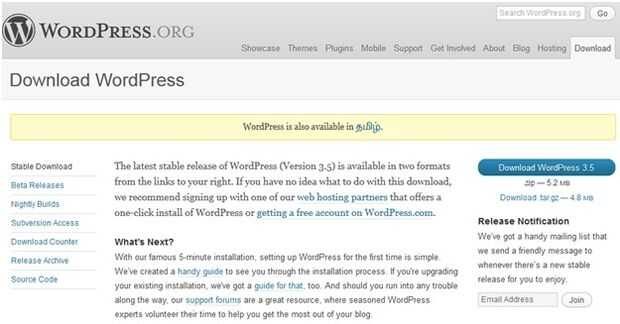 Bien, ahora es el momento de instalar WordPress. Visita http://wordpress.org/ y descargar la última versión de WordPress. (En nuestro caso era v3.5).