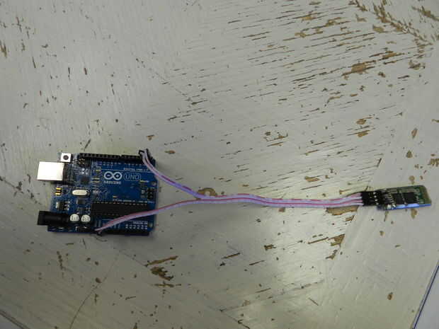 JY-MCU su debe tener cuatro pernos, con etiquetas para cada uno en la parte posterior. El pin VCC debe ir al pin de 5V en su arduino. El conector de tierra en su JY-MCU debe ir al pin de tierra en su arduino (duh) que está justo al lado de los pines de 5V. El pin TXD en el JY-MCU va al pin digital 0, que debe tener las letras RX junto a él. Finalmente, el pin RXD en JY-MCU debe ir al pin digital 1, que debe tener las letras TX junto a él. Los pines RX y TX están justo al lado del otro.