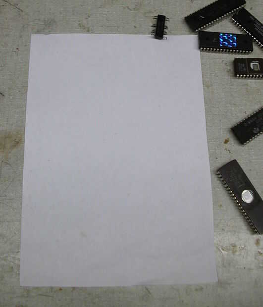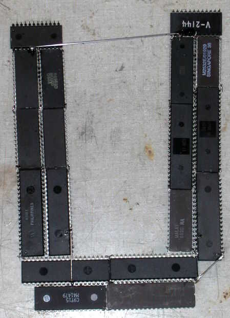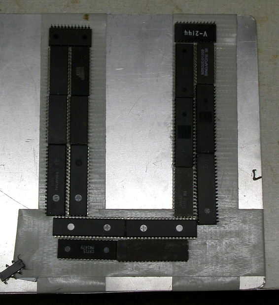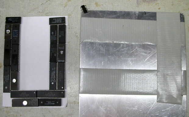 En primer lugar, fui a través de mi caja gigante de tarjetas de circuitos y sacó a todos y cada uno que tenía gran capacidad que DIP chips en zócalos. Luego arreglé en un pedazo de papel que yo había cortado a nuestro tamaño estándar. Terminó un poco más pequeño, pero quedó sin ICs, y habría sido mucho mayor si había añadido una tercera fila, o simplemente extendió. Poner alguna cinta en forma de U en un pedazo de hoja de aluminio de chatarra y volcó mi U en la parte superior, luego asomó todo bien para sujetar en posición para soldar. Terminé de soldar juntos los dos lados y la parte superior por separado, alineándolos y suelda las tres piezas juntas. El resultado final de que era algo flojo (No, es no lo que ella dijo.) por lo que descuidadamente soldado algunas piezas de música cable para apoyarlo. Es todavía no prueba de cachorro, pero no se supone que para hacer otra cosa que sentarse allí.