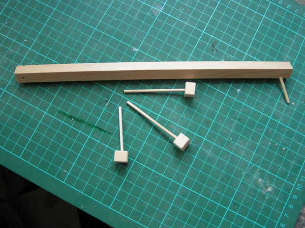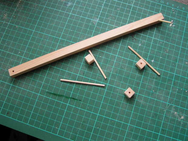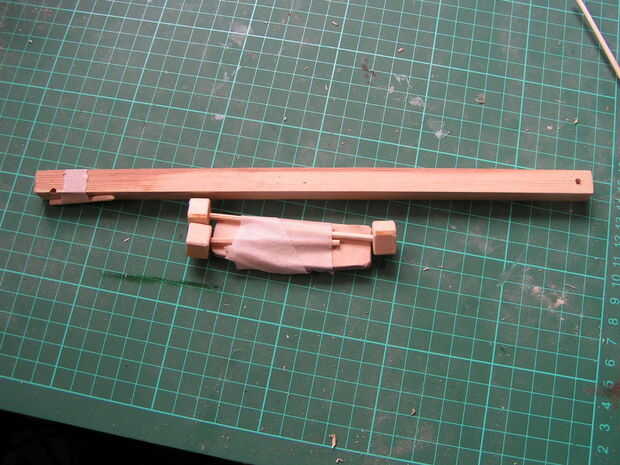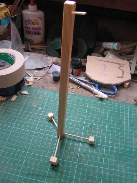 Corte y montado las piezas (la pata corta va a la espalda, gente), y había atado con cinta de enmascarar para su publicación. Podría hacer con una gota de woodglue a mantener en su lugar, pero estoy seguro de que el equipo puede hacer frente con eso.