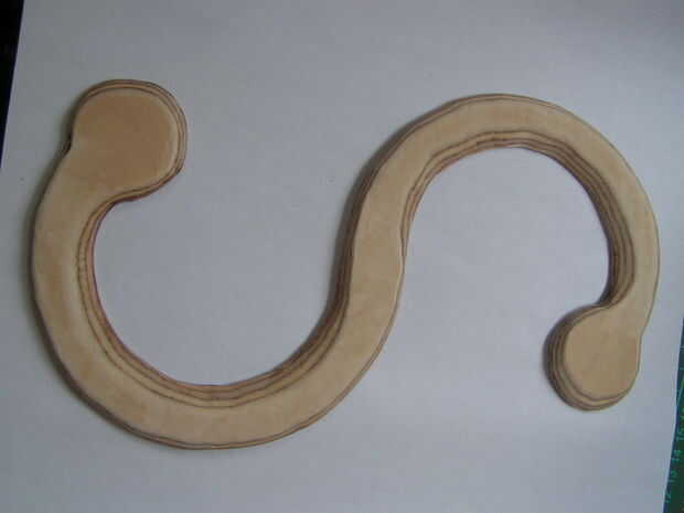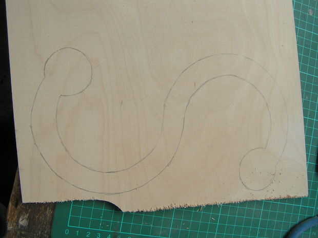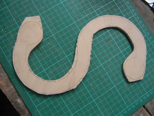 Todo esto fue jigsawed de la misma 1/4"madera contrachapada que utiliza para retornos de Robot y cometa oscurezcay decidió que los exteriores de las curvas de la S sería que los bordes delanteros, para que la S era lo correcto cuando está lanzado de la mano derecha.