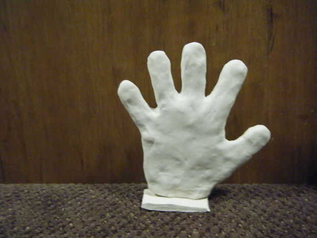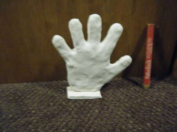 No tengo muchas fotos del proceso, pues he probado muchas cosas para hacer la mano que no pan (incluyendo madera, espuma de poliestireno, sólido sculpey, papel, etc.) que yo no estaba seguro que esto funcionaría. Por lo tanto, ninguna imagen durante la toma de la mano. También estaba muy presionado de tiempo. Lo siento. Pero tengo fotos de los pedacitos de cartulina utilicé.