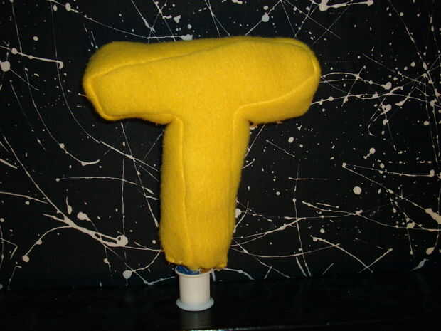Primero corte dos "T" y un rectángulo largo del paño grueso y suave amarillo. Luego coser el rectángulo alrededor de los bordes de ambos la s de "T" y lo rellenas. Luego lo cosí cierre.
