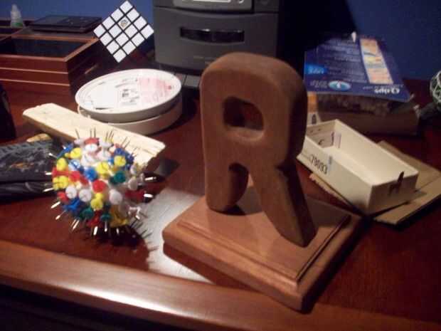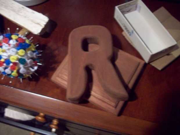 Yo había arraigado en mi tienda y encontró un trozo muy bonito de cedro que serviría como mi letra y base. Comencé utilizando una sierra de calar para la carta de cedro en bruto. En este punto fue bastante visualmente poco atractivo, así que usé mi Dremel para redondear los bordes de la parte delantera de la letra. Trabajé sobre la letra entera con papel de lija poco a poco consiguiendo más fino y más fino. Una vez fue super suave, mancharon la carta completa con temprano americano.